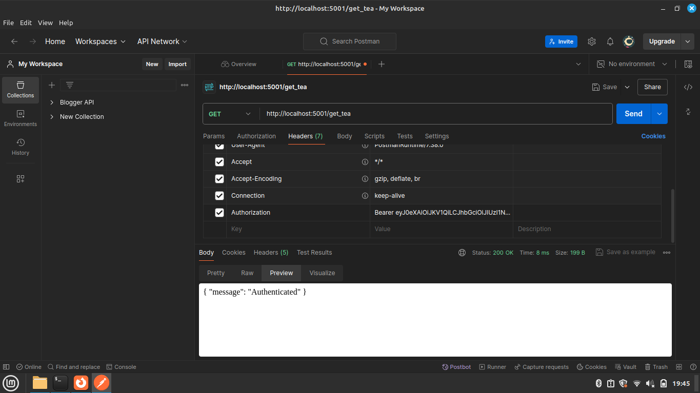 curl -i -H "Authorization: Bearer eyJ0eXAiOiJKV1QiLCJhbGciOiJIUzI1NiJ9.eyJ1c2VybmFtZSI6InByYXRpayJ9.syUkKDn6CV1olbN9kuU7K7w1n8LxJICH6wa4oADwNe4" http://localhost:5001/get_tea