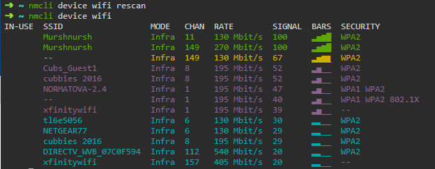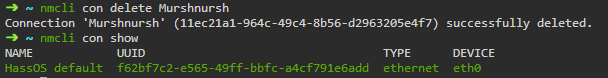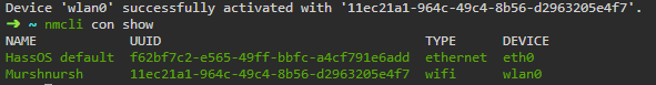That's it! Now you have two connections which are properly formatted. You can edit them interactively with further use of nmcli (static ip, for example).