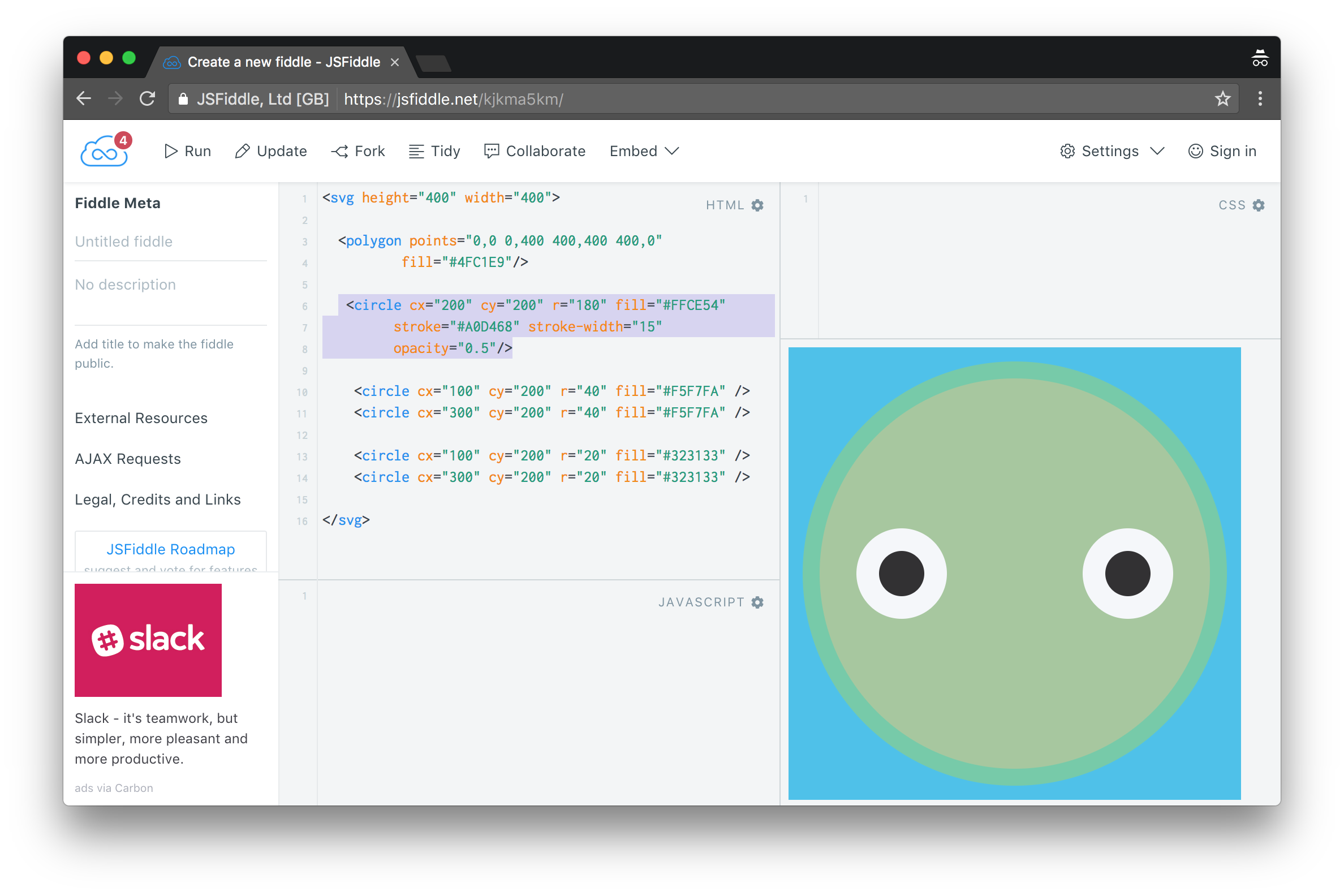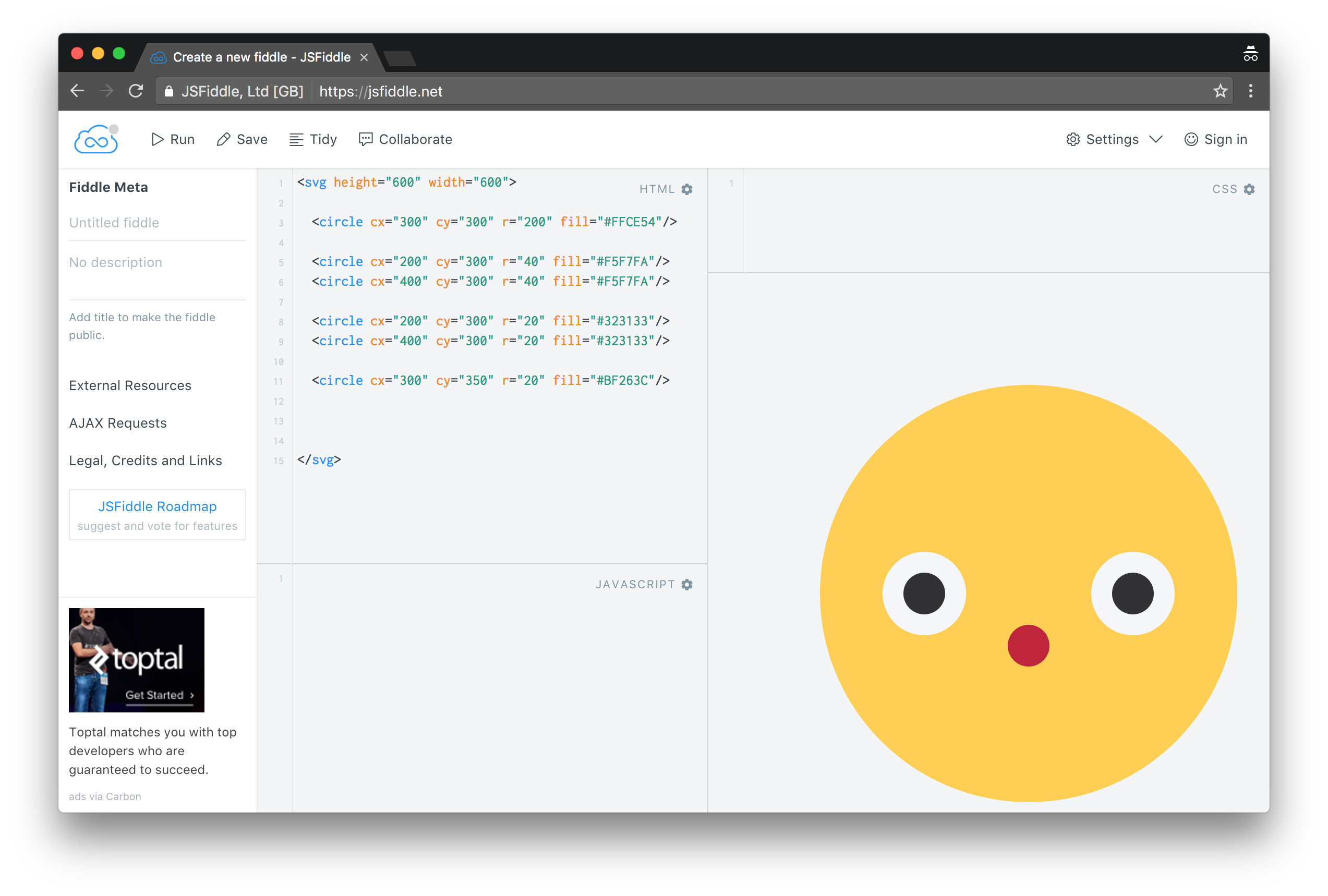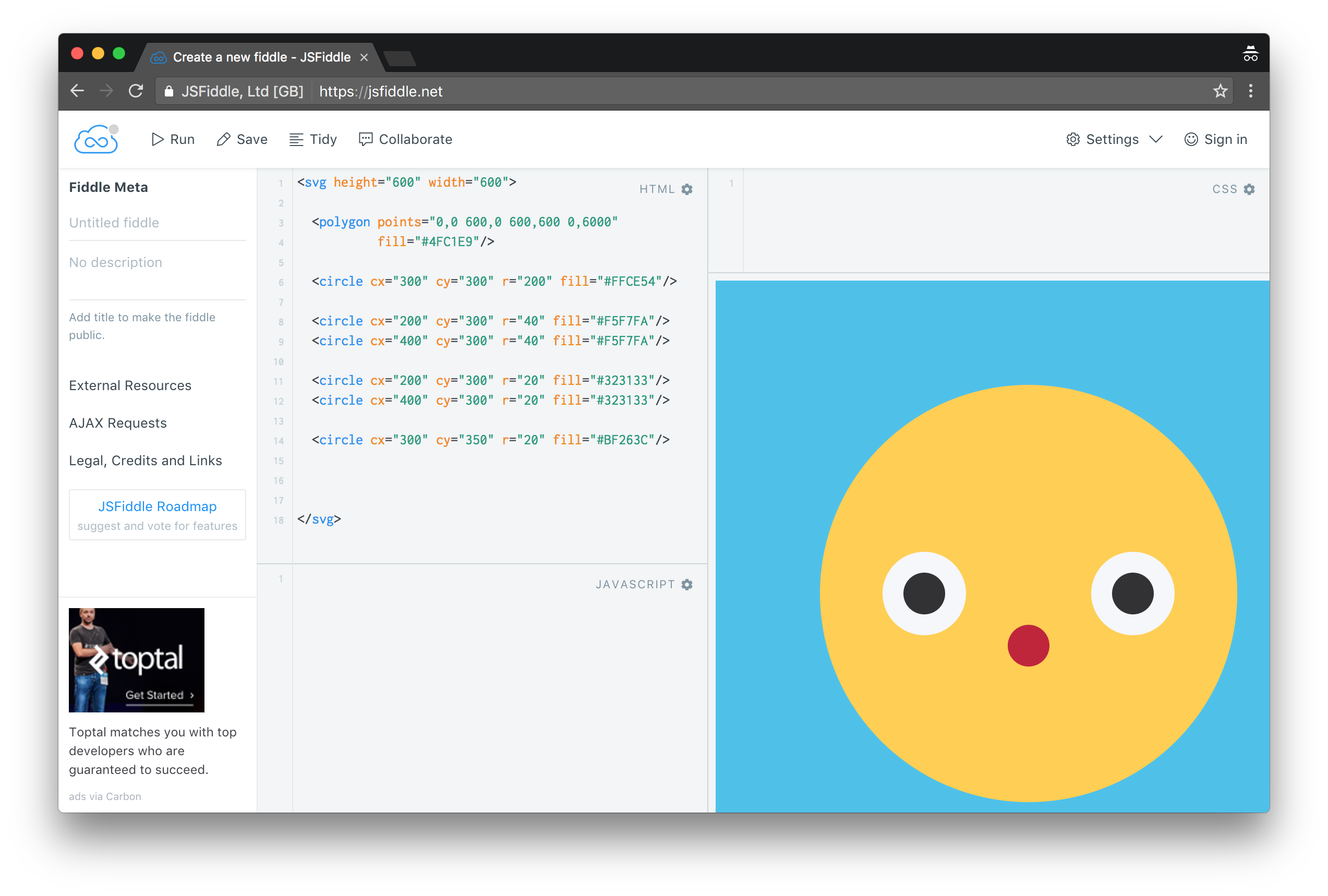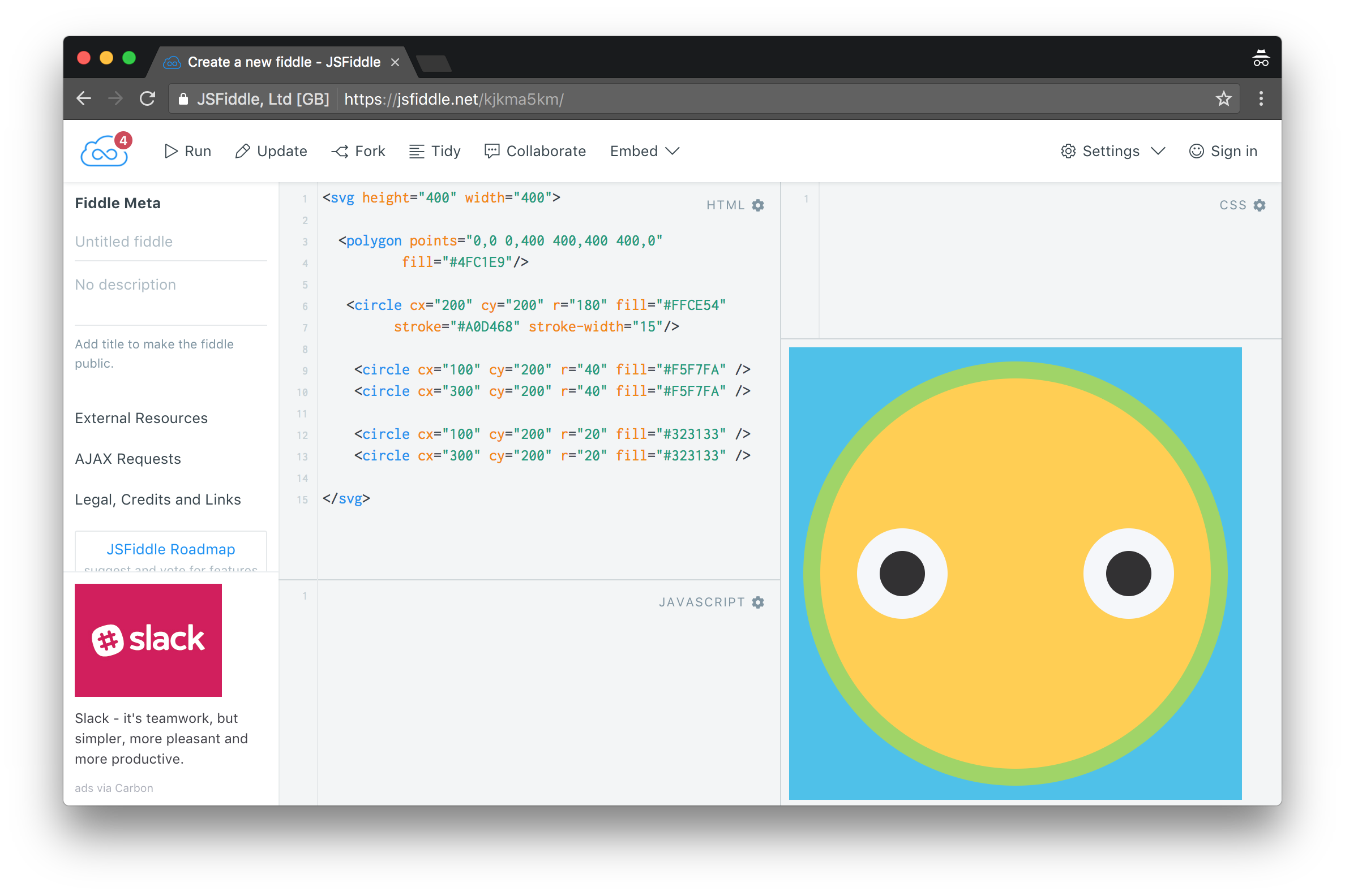 We're going to be using a website called JSFiddle to create our own emojis. First we need to open JSFiddle in a new tab (right click and open in new tab) http://jsfiddle.net/