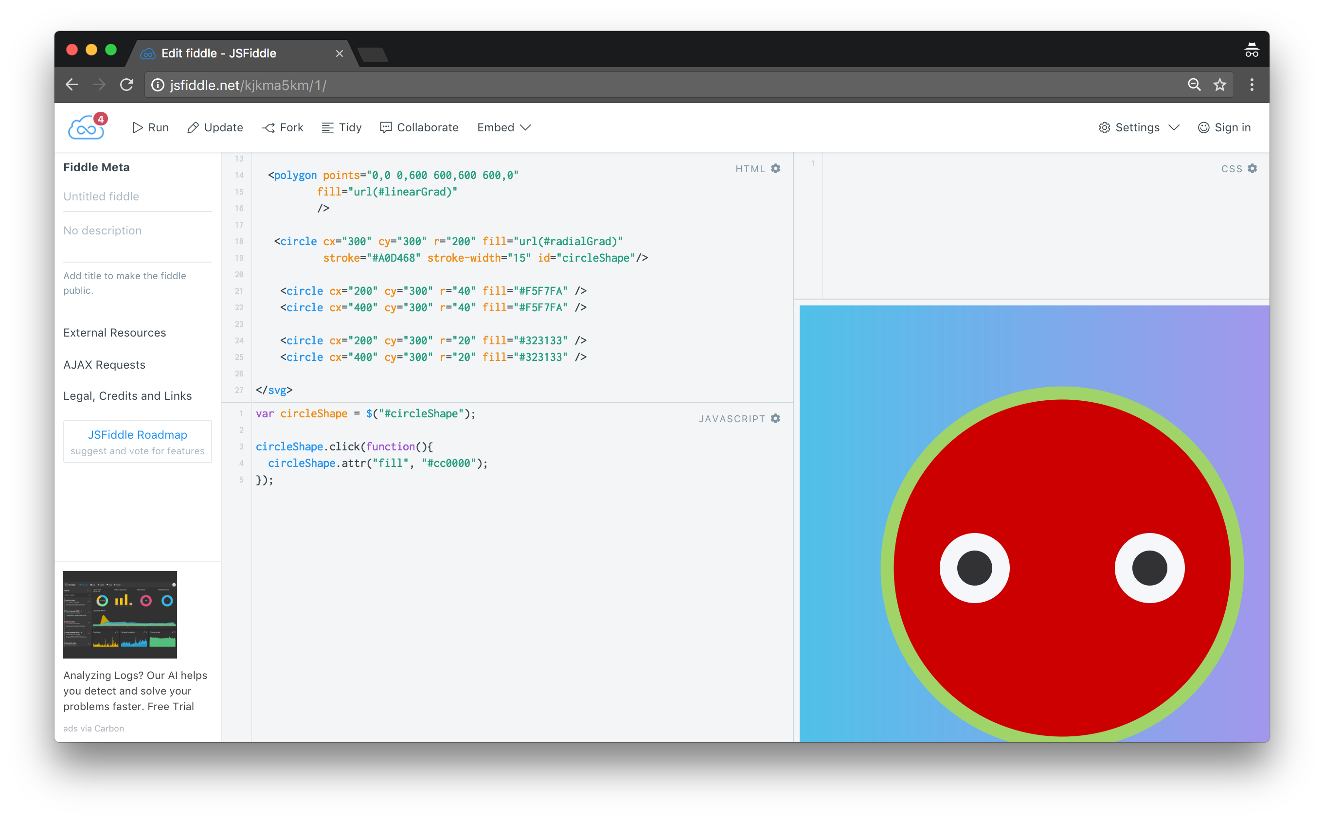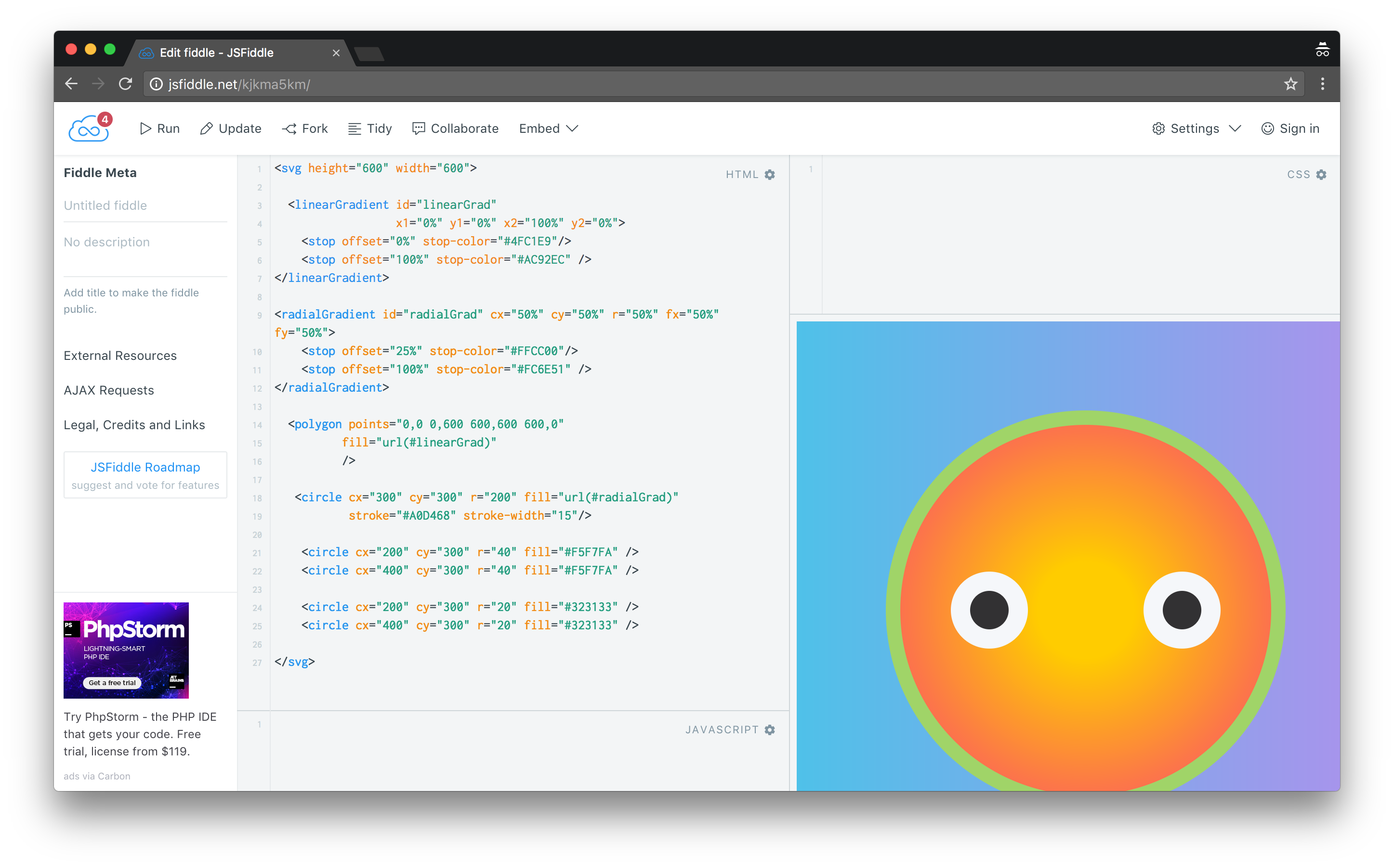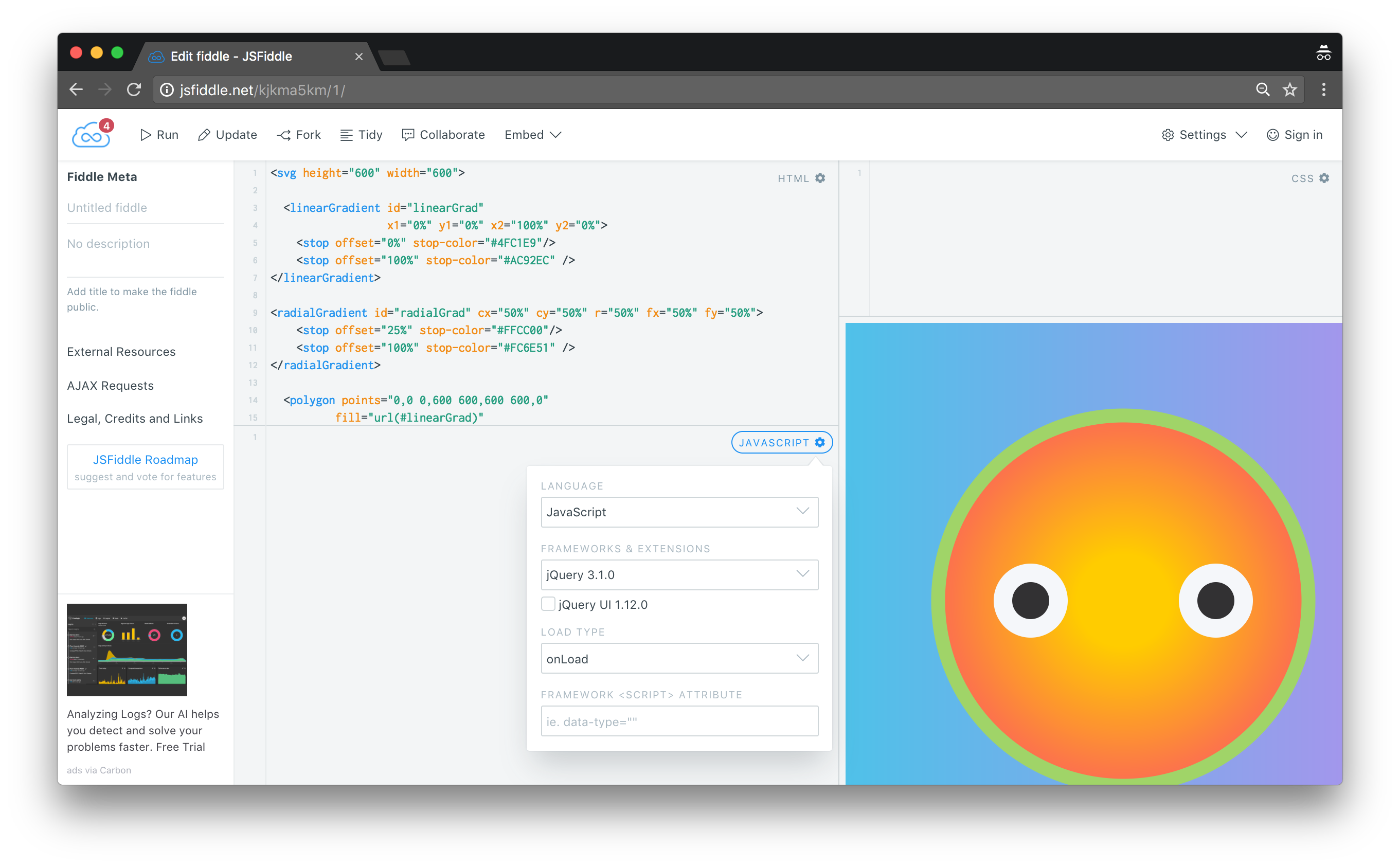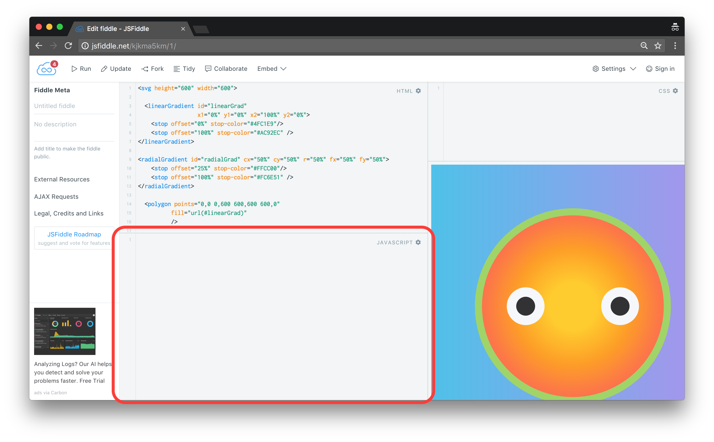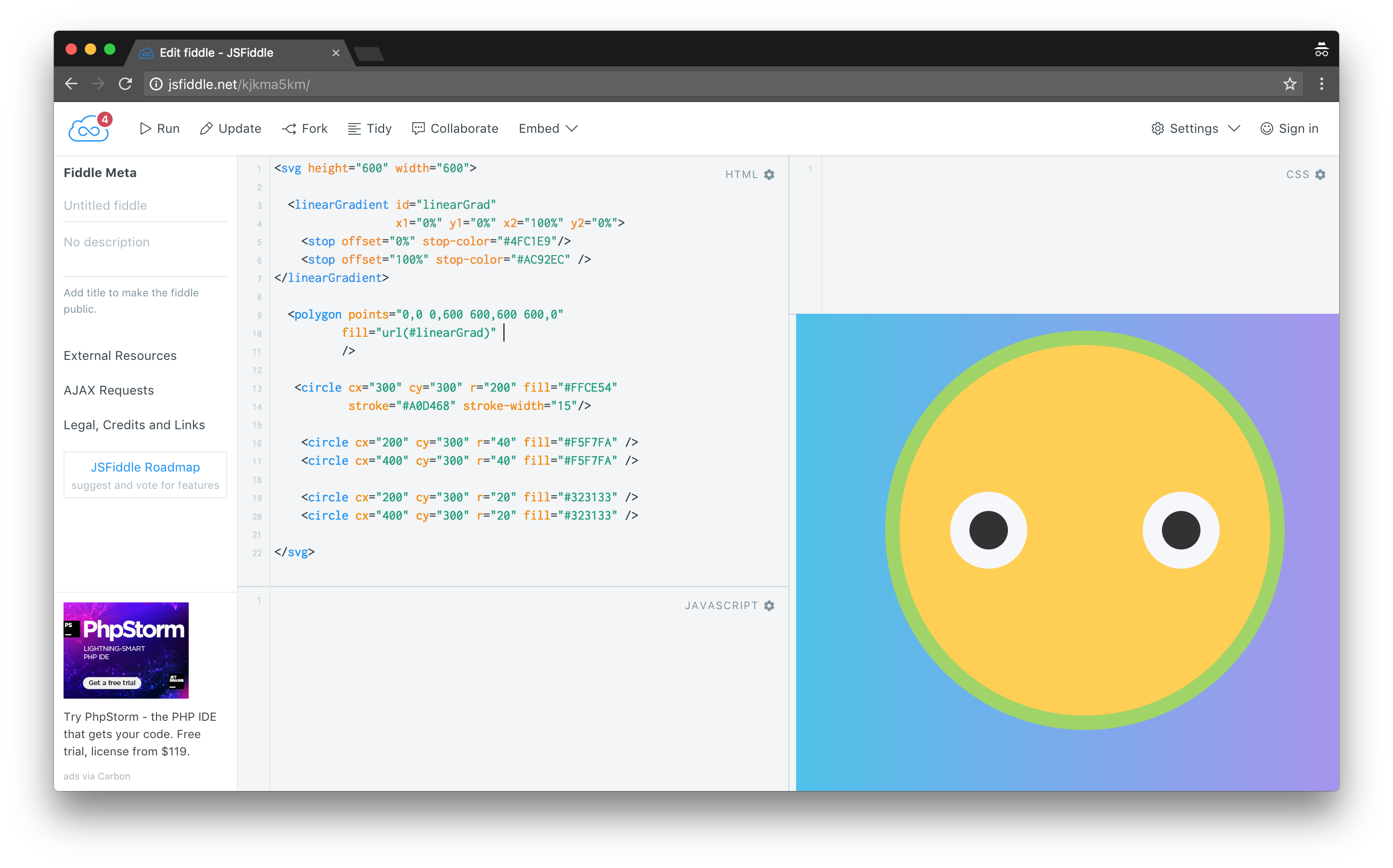 We're going to be using a website called JSFiddle to create our own emojis. First we need to open JSFiddle in a new tab (right click and open in new tab) http://jsfiddle.net/