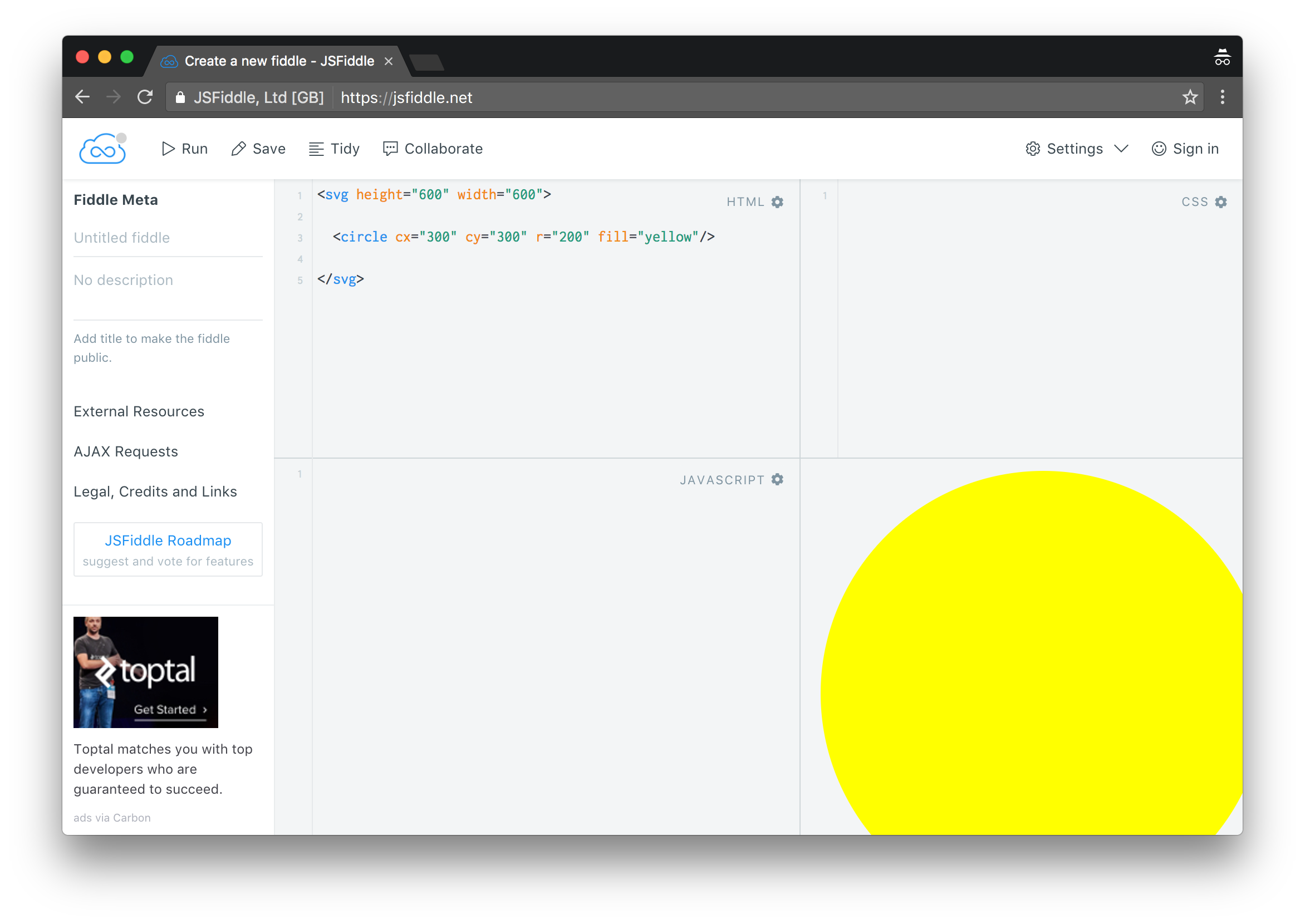 As we're going to be doing some drawing today - the first important thing to do is to create ourselves a piece of paper. We can do that by using a technology called SVG. Write the following into the HTML box in JSFiddle.