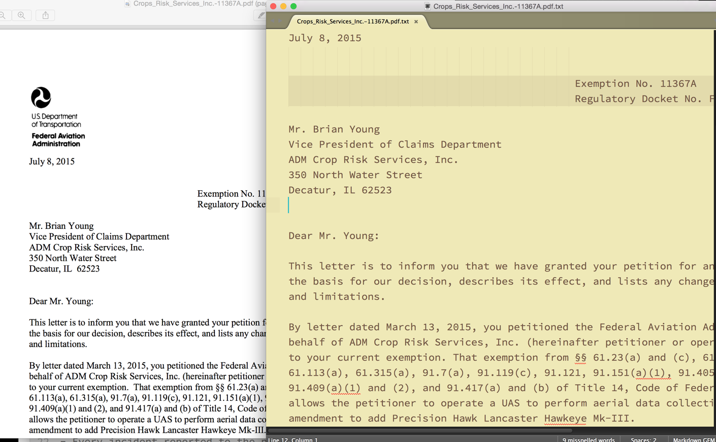 The Federal Aviation Administration is posting PDFs of the Section 333 exemptions that it grants, i.e. the exemptions for operators who want to fly drones commercially before the FAA finishes its rulemaking. A journalist wanted to look for exemptions granted to operators in a given U.S. state. But the FAA doesn't appear to have an easy-to-read data file to use and doesn't otherwise list exemptions by location of operator.