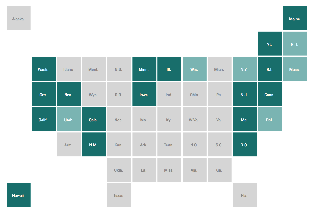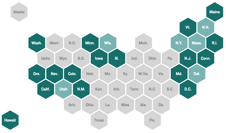 Tile grid maps are a great option for mapped state data where population figures are not part of the story we’re trying to tell with the map. Several news organizations have used this approach to great effect, including FiveThirtyEight, Bloomberg Business, The Guardian, The Washington Post and The New York Times.