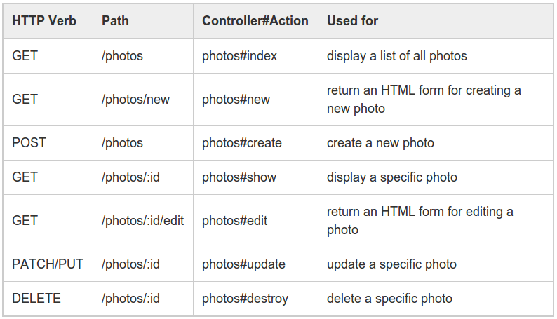 resources :photosRun rake routes to see such a table. Notice that some of the paths are the same, which is possible because their HTTP verb is different.