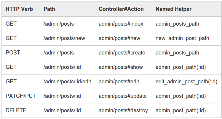 endThis will create common routes for Admin::PostsController and Admin::CommentsController. E.g. for admin/posts