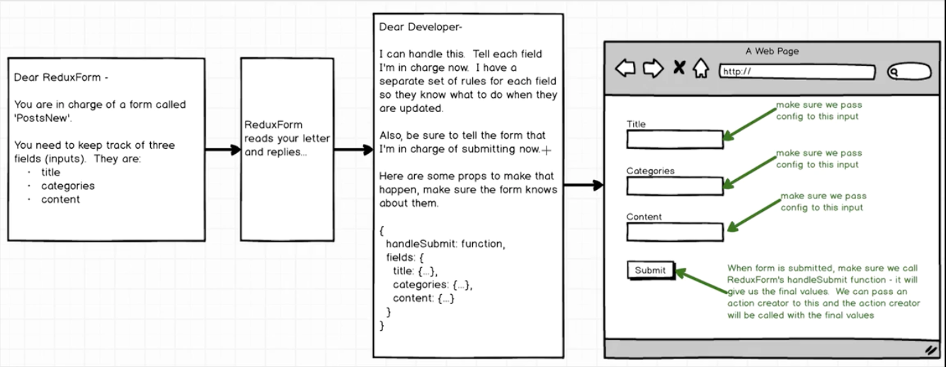 - If the errors object has a key that matches one of the fields in the form, reduxForm assumes the form is not valid, prevents submission, and adds properties to the fields configuration object. Gets