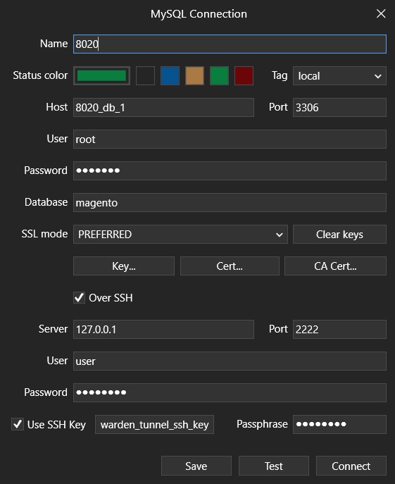 - MySQL Workbench: Here is a screenshot showing how you would configure Warden to connect to a project named