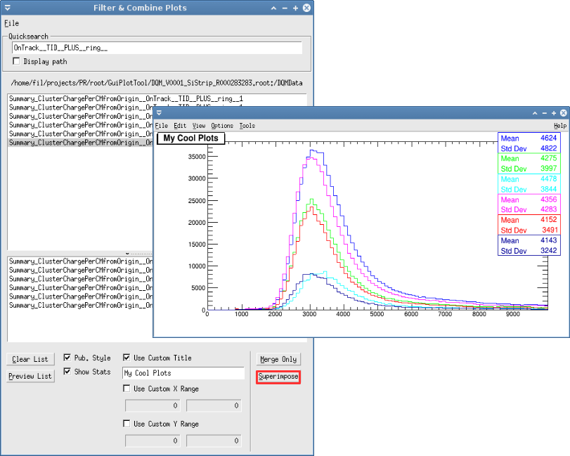 Check 'Pub. Style', 'Show stats, and 'Use Custom Title', and enter the string 'My Cool Plots' in the text field. Click on 'Superimpose'.