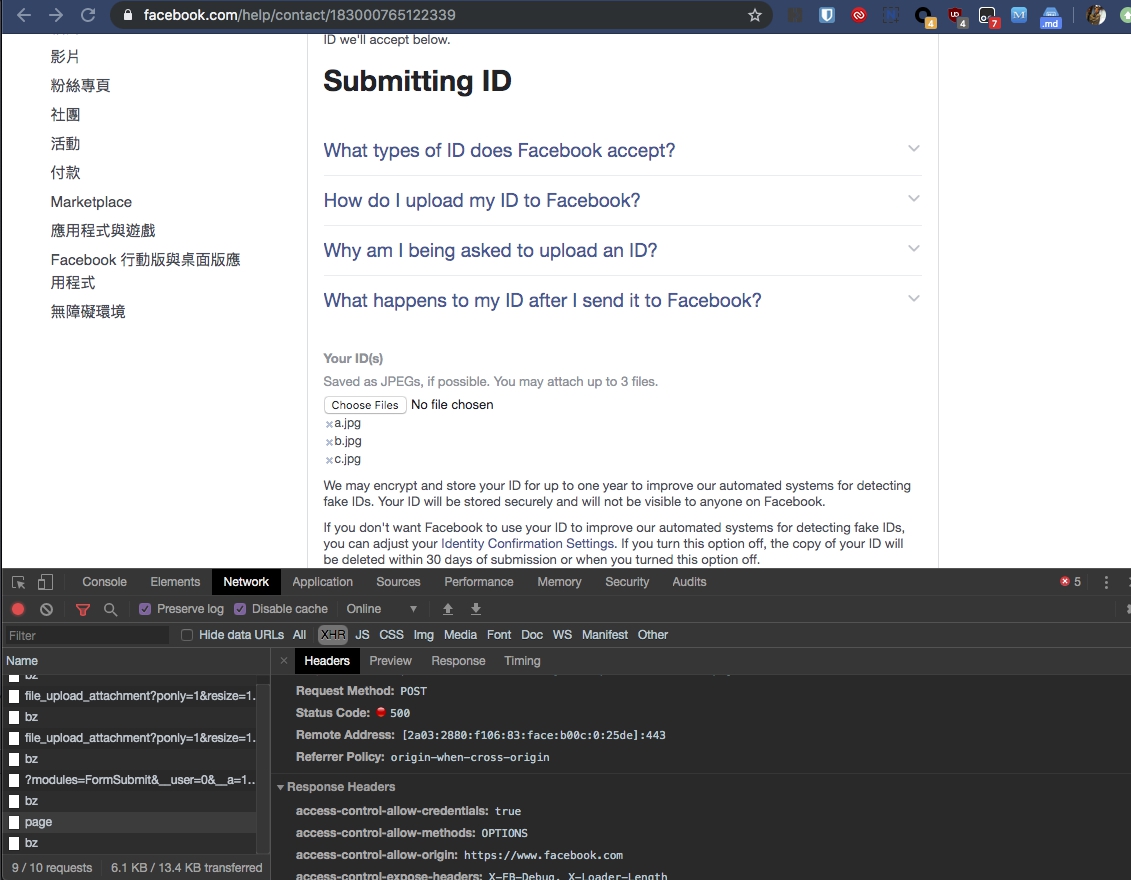curl 'https://www.facebook.com/ajax/help/contact/submit/page' -H 'Sec-Fetch-Mode: cors' -H 'Referer: https://www.facebook.com/help/contact/183000765122339' -H 'DNT: 1' -H 'User-Agent: Mozilla/5.0 (Macintosh; Intel Mac OS X 10_14_5) AppleWebKit/537.36 (KHTML, like Gecko) Chrome/77.0.3826.2 Safari/537.36' -H 'Content-Type: application/x-www-form-urlencoded' --data 'jazoest=2963&fb_dtsg=V8YOmXRZs84%3D&__vhsh=bc817427da1410f9c0f2454220572927&Field356294444474458[0]=AZWANBeogtiCCLkPg0aSHcGj7WuA8-wcKW8UsBfge5Cv0mghkDufWaZE97309yRhkiy0voKzbnnZ3qYQeJKDNCRItyFBf1tmfsZ20TH1DqAx99db1tmlJY0IZiXCDFF6WYPHpg5X_kpOuUKbkGpENa62ROKkJy3jIrS54pbX0TSF0Dx3BTk5LHscqKJFjHxxDVnzEk3tfW1uMNR4XjoIK04NYgZyX7JLWwFvC3ZApeMQe-99p4s-jwS6cgcxcDXQg6OmJeW2PLOLRWMkatJnveErZpOlZHVc8s_eh2D6tnanzhB3-49tMK31g_uf3-V52YdkK8gcHL6zX5O3PiK3gQoy&Field356294444474458[1]=AZWR353TvM7l9Pkt-LPedSmdT83ZDRnvRJoDkKkeytRhgQEVi43UMhzWsjm77QSX_jz-kHlWOSGWq6ho7g_3Z_D1PcucRjqPuV4chXhcA9zbQ0dBi0m9j-IC_gxWZZsTTcncngcCt9ELe4-gnxxR1TpZqECwy9F9yJIeJwOBsDBS8MHgZJ6wKWzxxjbegHVCnlmylSCdwvrjs0fX0KD_z-VkItZnt1-LMfiEXE1YR8UZzsTZb9eae8AJZZpYkmnlG9gQ9BCym78FAEbKA6z-Oodlps4LNa4dsieUJk4Ue7rV8rMrz7-UAX8E5jSbkcWBKNJ9EN-gaoEChsxz8QNJRonV&Field356294444474458[2]=AZXsEaIZ9shBd8qkI-NOENWpiUm4oQzOz8klhU7rtw6Jb_JgRfkK7svdv6YoRTLegDzFGlQEQuUexbhzRJTZH3fpYTkOq3U7UR9v5Wie7msqUh3l4u91QkgidtOw1XrsYmGLy_fSfdHtrJObtYFwwL98wqPr0AdPUnKwcmkOTvvjJh2mmte0Y4xsZgIaOSWgQmclZ4VpNo9p20s2Z0WFD1jic7eprLrteQHLqG8lSiR-2Qo2qgtQ9gecMUfC1Hc4SGuu3xhd8fdlowXEwMm4yNI7H0wC5-9QpL28szriRkNU-8lfEPW2VWi0Zb6ENa2IzpREwX_LYKaxDSay7vT8i0VQ&Field678538712279760=festum%40g.pl&support_form_id=183000765122339&support_form_hidden_fields=%7B%7D&support_form_fact_false_fields=[]&__user=0&__a=1&__dyn=7xe6Fo4OQ1PyUhxOnFwn84a2i5U4e0yoW7oowMxW0DUeUhwmU3Mx60yo5K0nCq1ewcG0KEswDwb62W2y1Aw60KdwnU1e42C220qu&__req=h&__be=1&__pc=PHASED%3ADEFAULT&dpr=1&__rev=1000844139&__s=%3Ae56c9v%3A3r75y2' --compressed