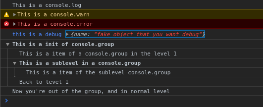 | console.debug("this is a debug", {name: "fake object that you want debug"}) | |