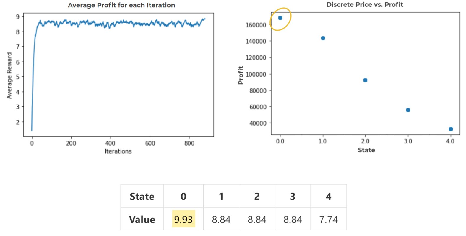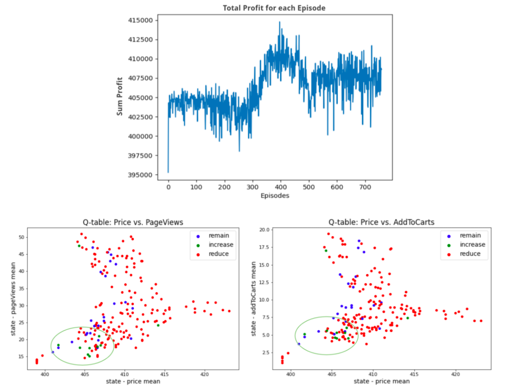 The previous figure shows that the peak of predicted profit is located at nearly 410 dollars. In the Q-table plot, we can see that most states with prices higher than 410 are suggested to reduce prices, and the increasing price suggestion takes place as prices being lower than 410, which meets our expectation.