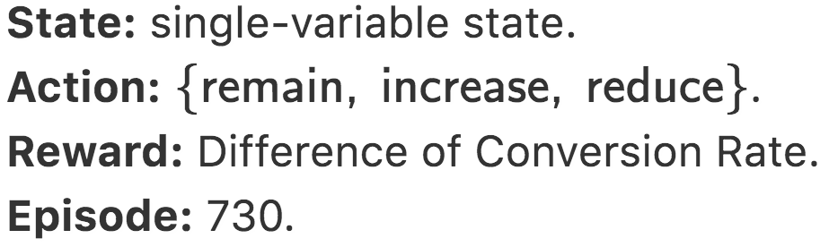 Under the framework of Markov Decision Process, in our case, the state space consists of attributes of the product and the seller. The action space represents the behaviors of changing the price, for example, increase or decrease. As for the reward space, we referred to a thesis in 2019 which conducts dynamic pricing on an e-commerce platform with reinforcement learning, applying profit and difference of revenue conversion rate as the reward function, which would be explained more clearly later in the Deep Q-learning chapter.
