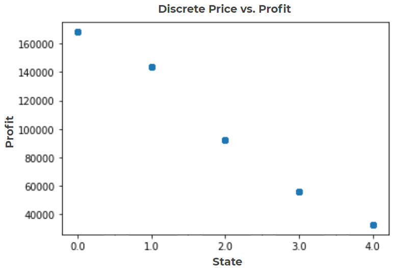 To obtain the state space, the price variable is discretized into five points. The agent can choose to move to any of the states as its action.