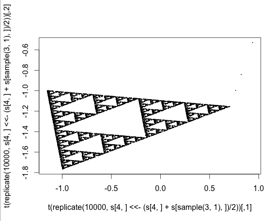 | s=embed(rt(5,1),2);plot(t(replicate(1e4,s[4,]<<-(s[4,]+s[sample(3,1),])/2)),cex=.1) |