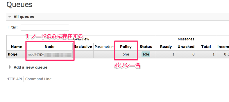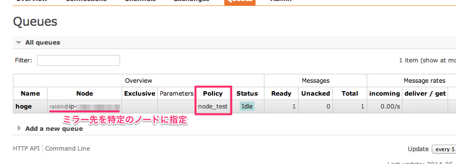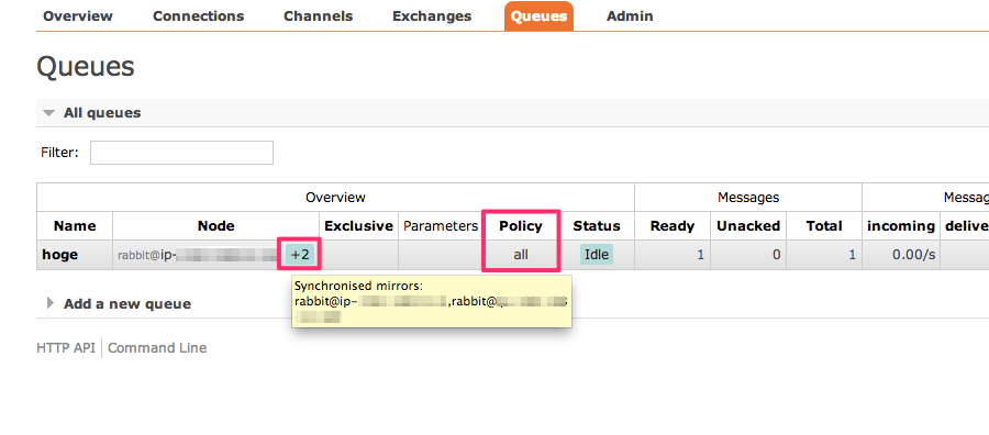 | exactly | count | キューは count に指定した数のノードにミラーリングされる。但し、クラスタ内のノード数が count より>少ない場合には全てのノードにコピーされる。 |
