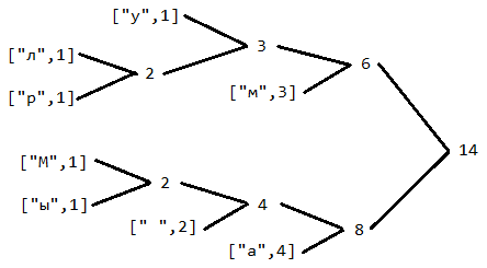 // => [["М",1],["ы",1],["л",1],["р",1],["у",1],[" ",2],["м",3],["а",4]]4 / Построение кодового дерева