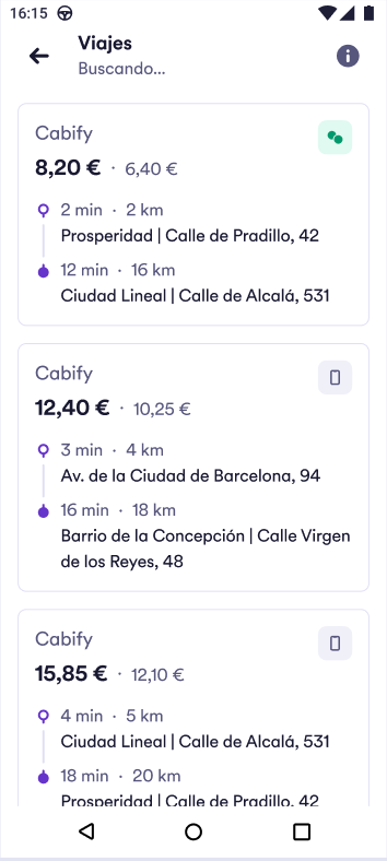 Instead of finding ourselves the closest car, we would present drivers with a list of all nearby journeys in their app, with information about their price and distance, and let them select one of their likings. We call this feature the trip selector. This way, we would avoid the risk of going through several drivers before finding an interested one. Here is a sample screenshot of what this new feature would look like in the driver's app: