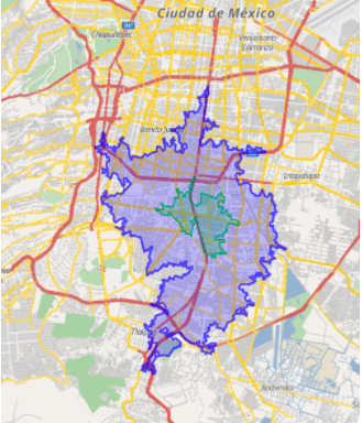 However, the expected time to reach A from B in a city is not 100% determined by the Haversine distance: Cities are known to be places where a large amount of transport infrastructure (roads, highways, bridges, tunnels) is deployed to increase capacity and reduce average travel time. This heavy investment in infrastructure also implies that bird distance does not work so well as a proxy for the travel duration. The isochrones for travel time from a given location drastically differ from the perfect circle defined by bird distance, as we can see in this example from CDMX where the blue area represents what is reachable with a 10 min drive.