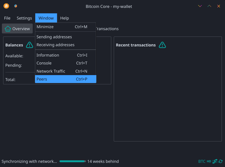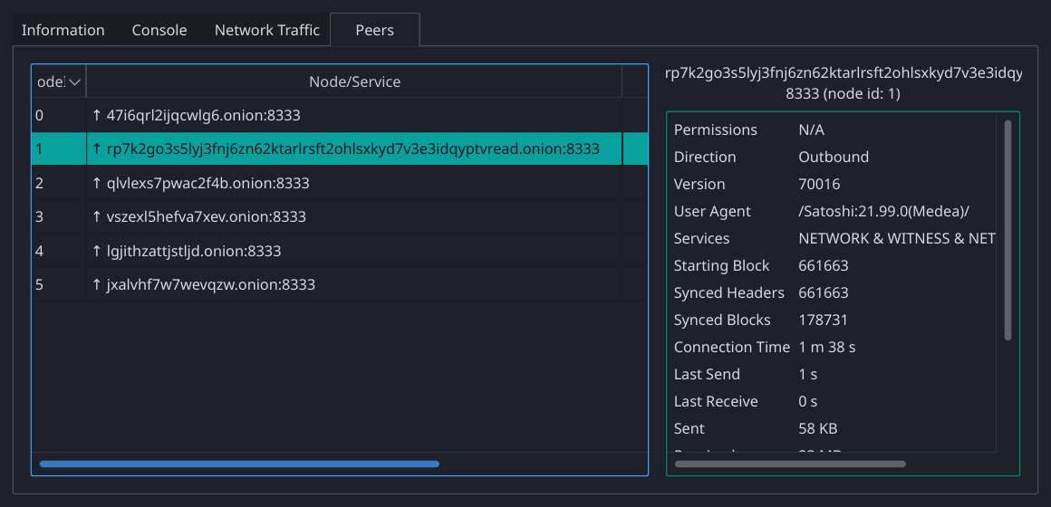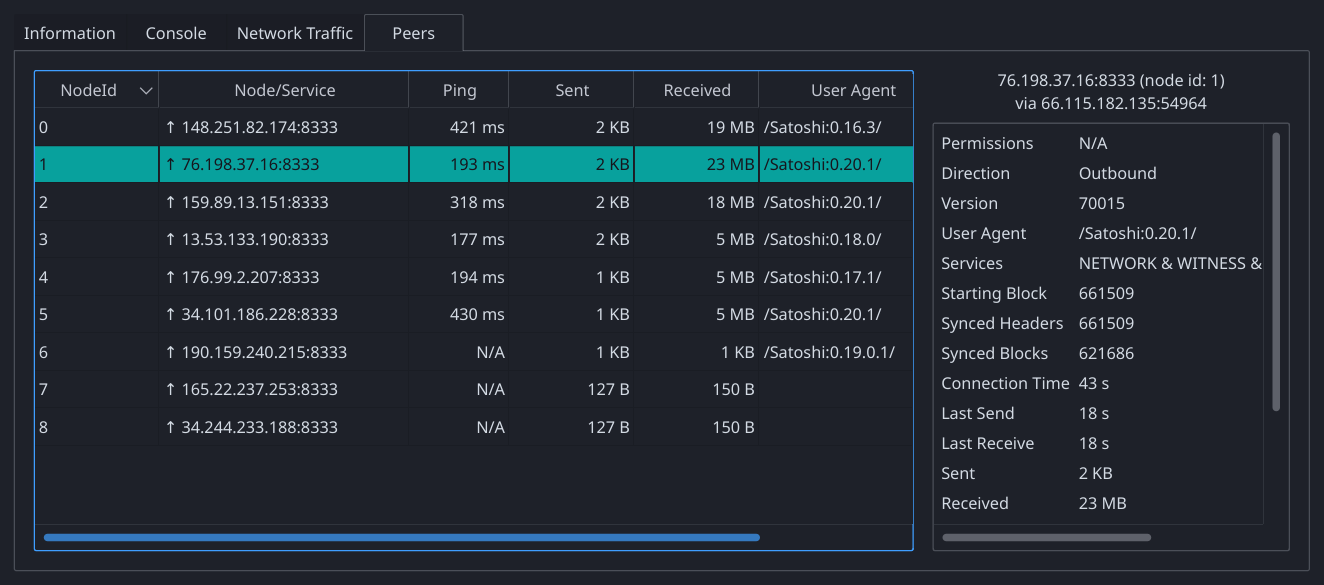 ./src/qt/bitcoin-qt -datadir=/tmp/21-rc-test./bin/bitcoin-qt -datadir=/tmp/21-rc-testNavigate to and click on Window->Peers to bring up information on the connected Peers.