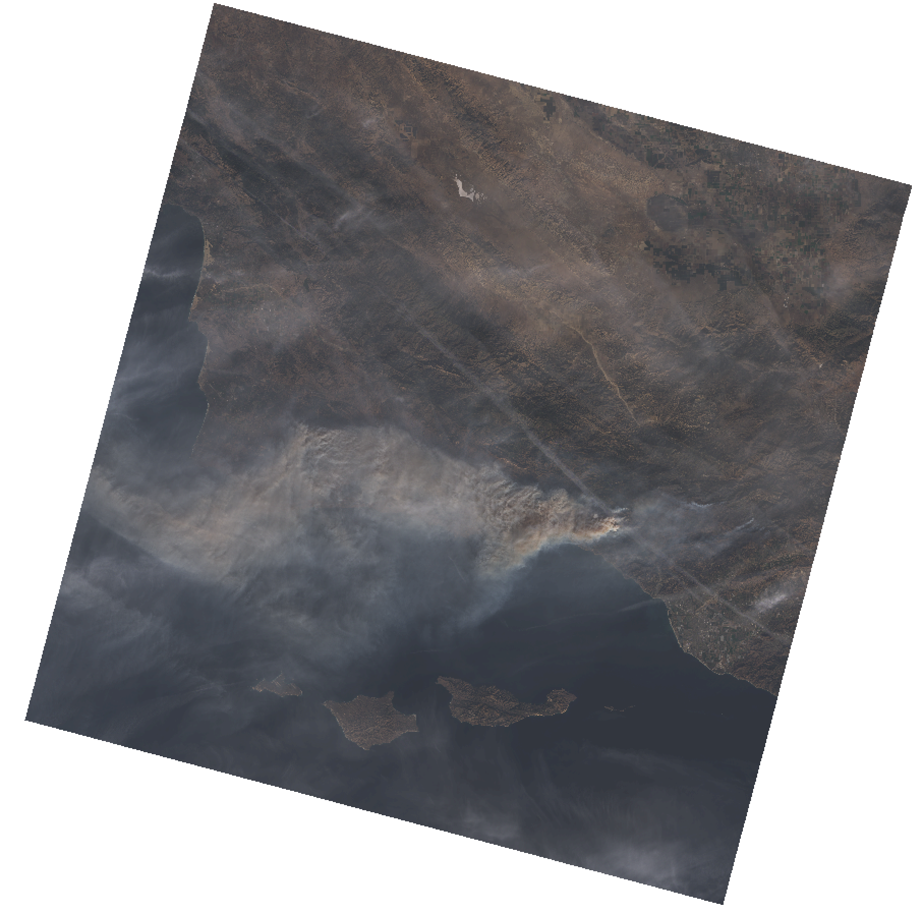 $ mapbox upload jacques.santa-barbara-432 432-dehazed.tifOur 432 composite shows the smoke well, but it's difficult to pinpoint the fire itself. Let's build a 752 composite, which should let us "see" it a bit more clearly.