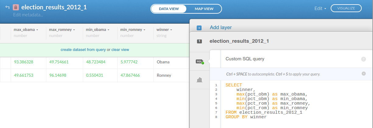 https://elections-cartocamp.cartodb.com/tables/election_results_2012/public/mapThis will import the dataset as cartodb_query or something like that. We need to change the name of the table to something more reasonable. Change this by: