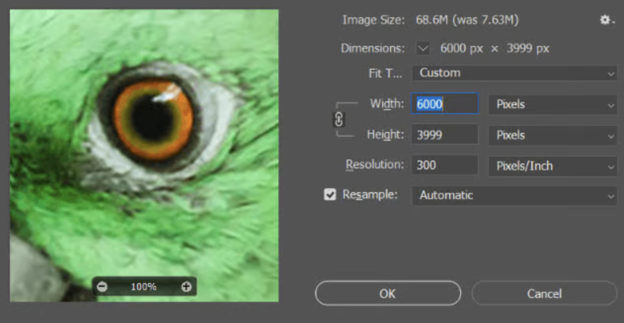 Now, notice the quality of the bird in the preview panel above. Let’s bump it up to 6000 pixels wide, keeping the same aspect ratio, and see what we get.
