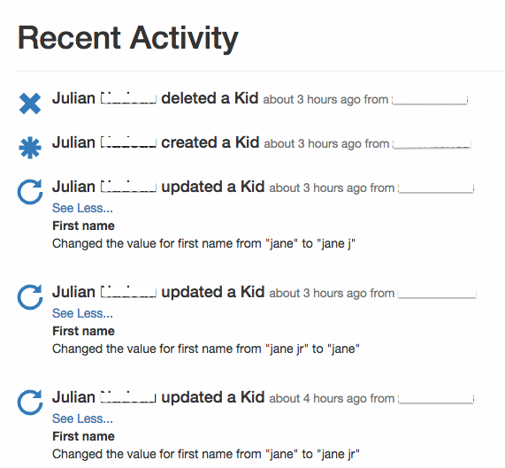 Activity.register_activity(User.current_user, self, "changed their password", User.current_ip_address). The second arugment is what you are changing, the third argument is an action (or what happened). - Include a partial render call in a view you want to see the activity list