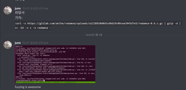 r.interactive()위 코드를 추가해두고 이번엔 다른 퍼저 (https://github.com/rmadair/fuzzer/blob/bf77b05d19aa53d6317481318faf5598e7fd65f2/client.py#L27) 를 시드로 해서 돌렸더니,,, 하 역시!!!!!