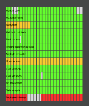 As time progresses, new build status samples are added to the right, while older samples are removed from the left. This view allows you to quickly see the health of your jobs as well as any time trends.