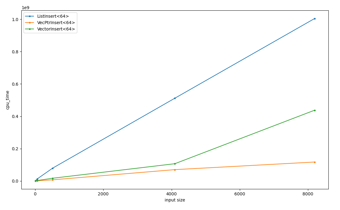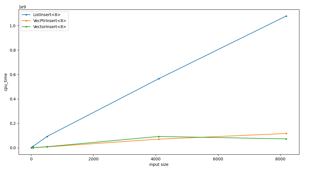 What surprised me the most is that VectorInsert didn't really outperform VecPtrInsert at 8-byte elements, but maybe with a more chaotic memory allocation pattern a vector of pointers could be more unpredictable while the vector of elements maintains predictable performace, idk tho. One important aspect is that we're not really doing a linear search on the vector cases, we just pick an index an insert there. With the linear search we would have to chase each pointer in the vector up to the insertion point in order to see the contents, probably in that case the plain vector would outperform the vector of pointers.