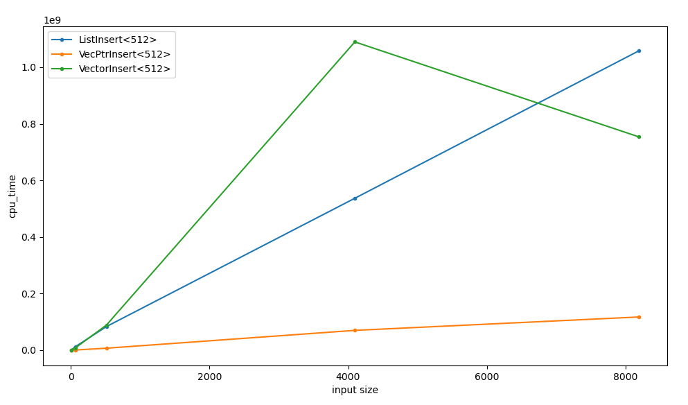 As you might expect, both the linked list and the vector of pointers don't really care about the size of the elements, and both appear to scale more or less linearly over the amount of insertions, it's just that the linked list has a much steeper slope. The plain vector does struggle as you increase the element size.