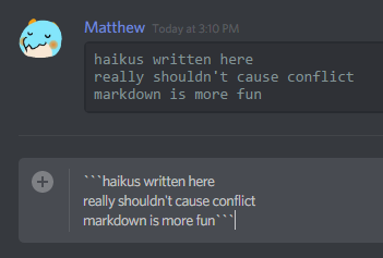 You can also use three backticks (```) to create multiline code blocks, like this beautifully written haiku.