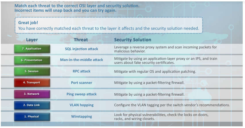 Level 3: Network - Ping Sweep attacek to gain information = packet-filtering firewall - Spoofing = IPS prevent attack