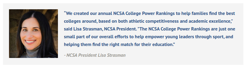 <p>“We created our annual NCSA College Power Rankings to help families find the best colleges around, based on both athletic competitiveness and academic excellence," said Lisa Strasman, NCSA President. "The NCSA College Power Rankings are just one small part of our overall efforts to help empower young leaders through sport, and helping them find the right match for their education.”