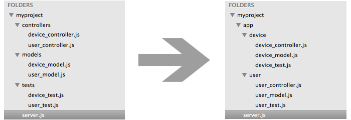 - Having multiple top-level folders, all of which are mvc code, is not conceptually clear. They should be part of one directory (taking us back to #2). Having every folder at the top level be a completely conceptually distinct part of the app (database vs. app vs. config vs. tests) is a clarifying convention.