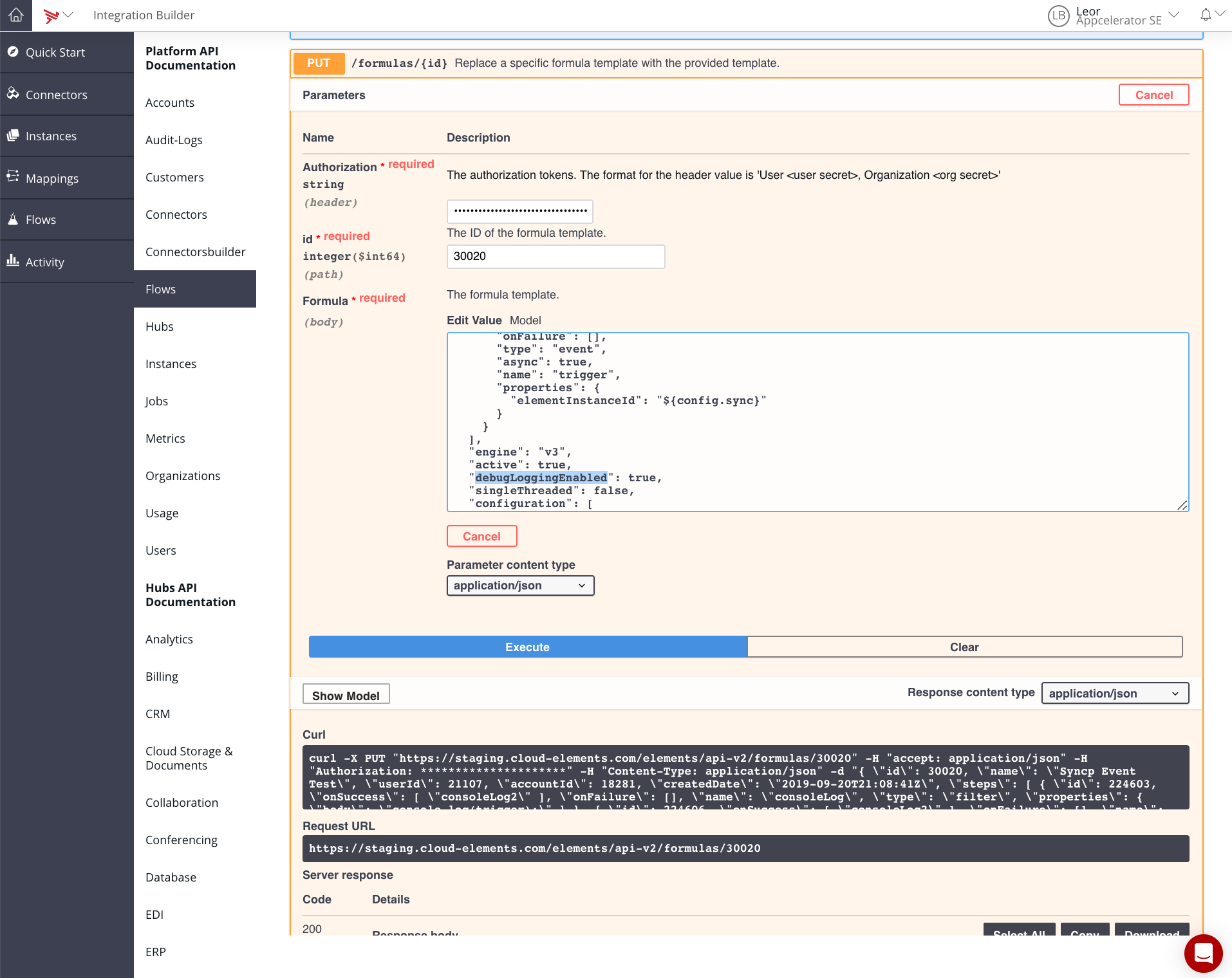 Go to the PUT /formulas/{id} method and paste in the ID and response above