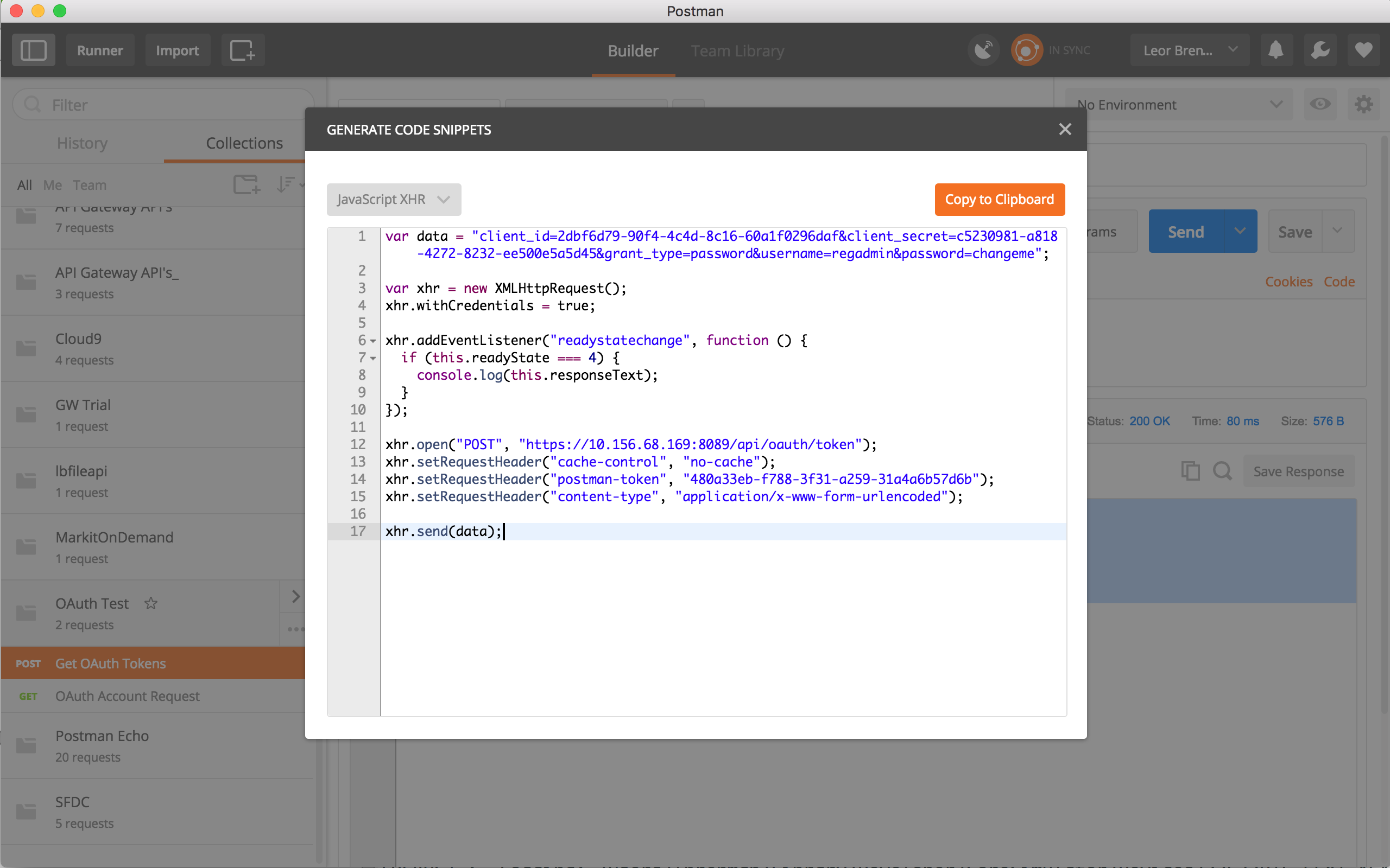}POSTMAN provides a javascript XHR code snipet we can use as a starting point for our Titanium code to get a token.