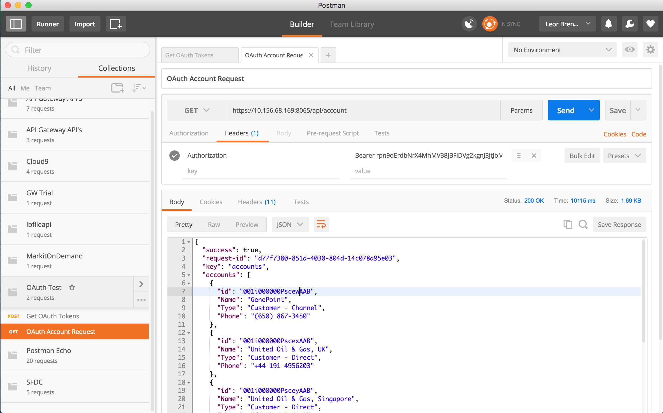 curl -X GET -H "Authorization: Bearer rpn9dErdbNrX4MhMV38jBFiDVg2kgnJ3JtJbMuahh94rzTyZ5M4sqS" -H "Cache-Control: no-cache" -H "Postman-Token: 9bfce815-9566-2e1f-4987-6c95924c6fcc" "https://10.156.68.169:8065/api/account"and in POSTMAN: