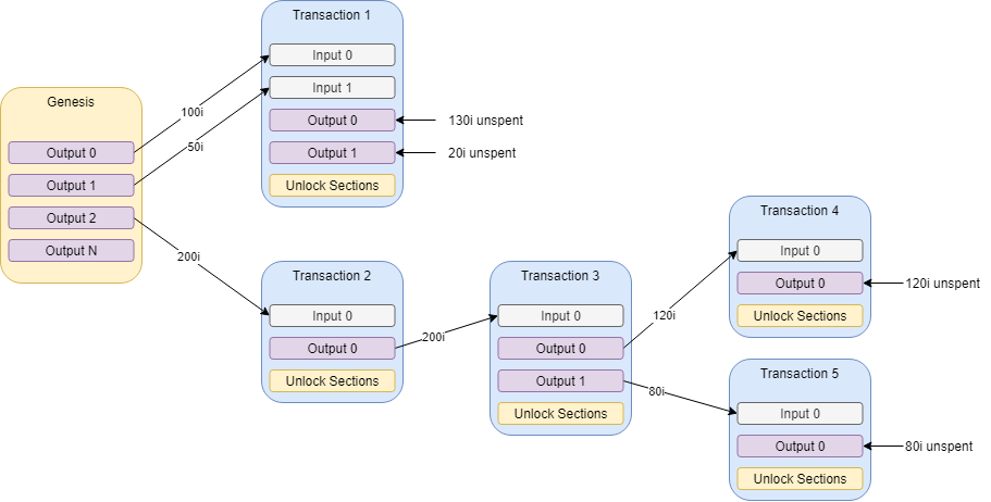 Input Typevalue must be 0, denoting anUTXO Input.UTXO Input:Transaction Output Indexmust be 0 ≤ x ≤ 127.Unlock Indexmust be ≤ highest seen index + 1. The first defined input must start at index 0. Sequence examples of inputsUnlock Indices:- Valid sequence: