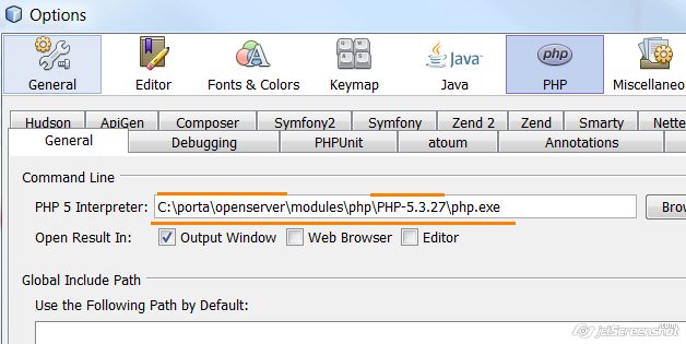 Закладка General: тут проверяем, чтобы был указан корректный путь к исполняемому файлу PHP (из установки OpenServer). Смотрим иллюстрацию и по аналогии настраиваем для своего каталога установки: