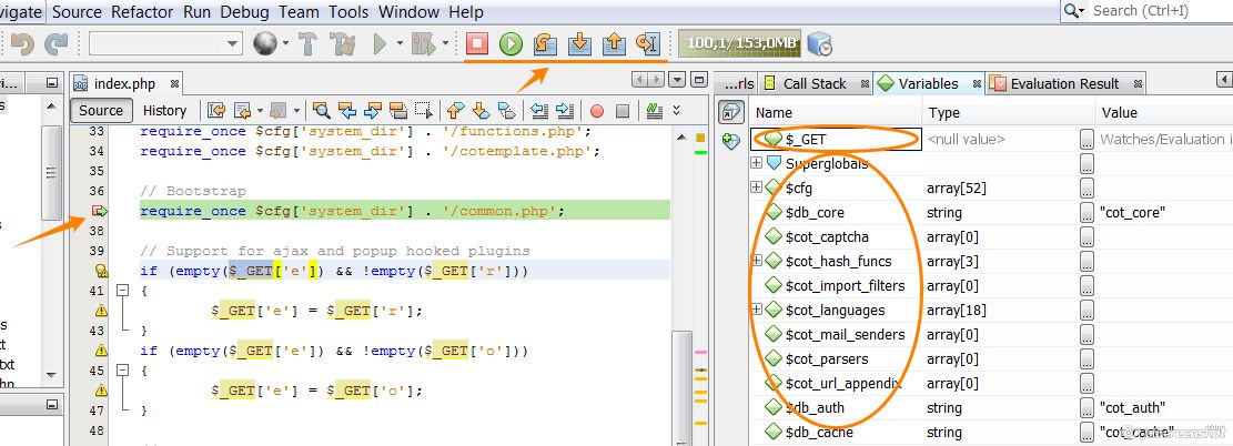 Будем выполнять код пошагово - нажмем F7, чтобы войти в блок подключения файла common.php. IDE сама откроет подключаемый файла и отобразит текущую строку выполнения. Далее можем построчно двигаться по коду нажимая (F8 — следующий шаг), и наблюдать за значениями переменных.