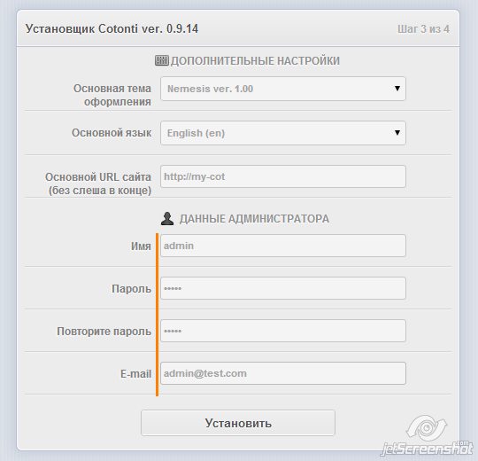 Теперь вы должны увидеть стандартную страницу установки Cotonti: