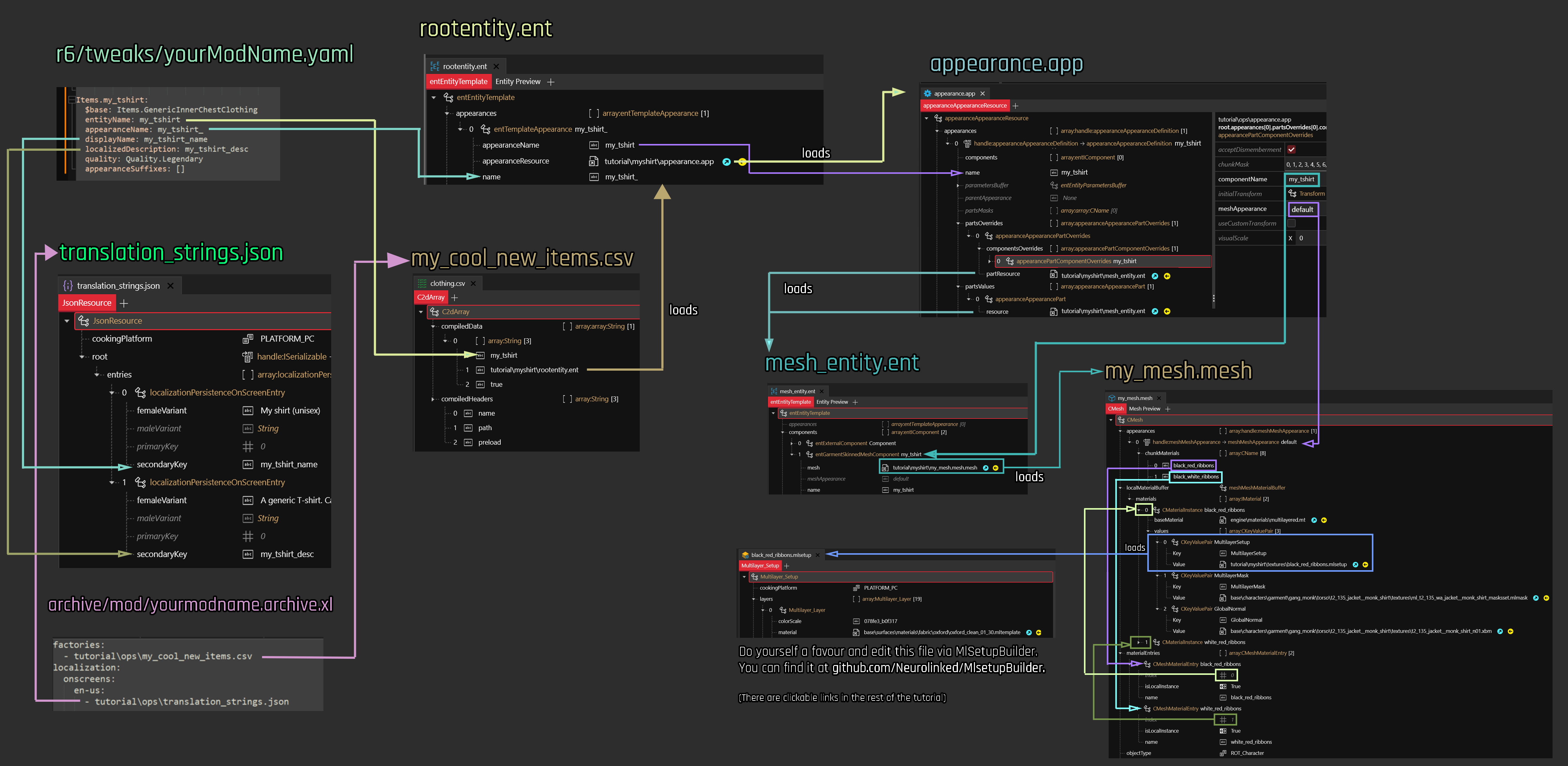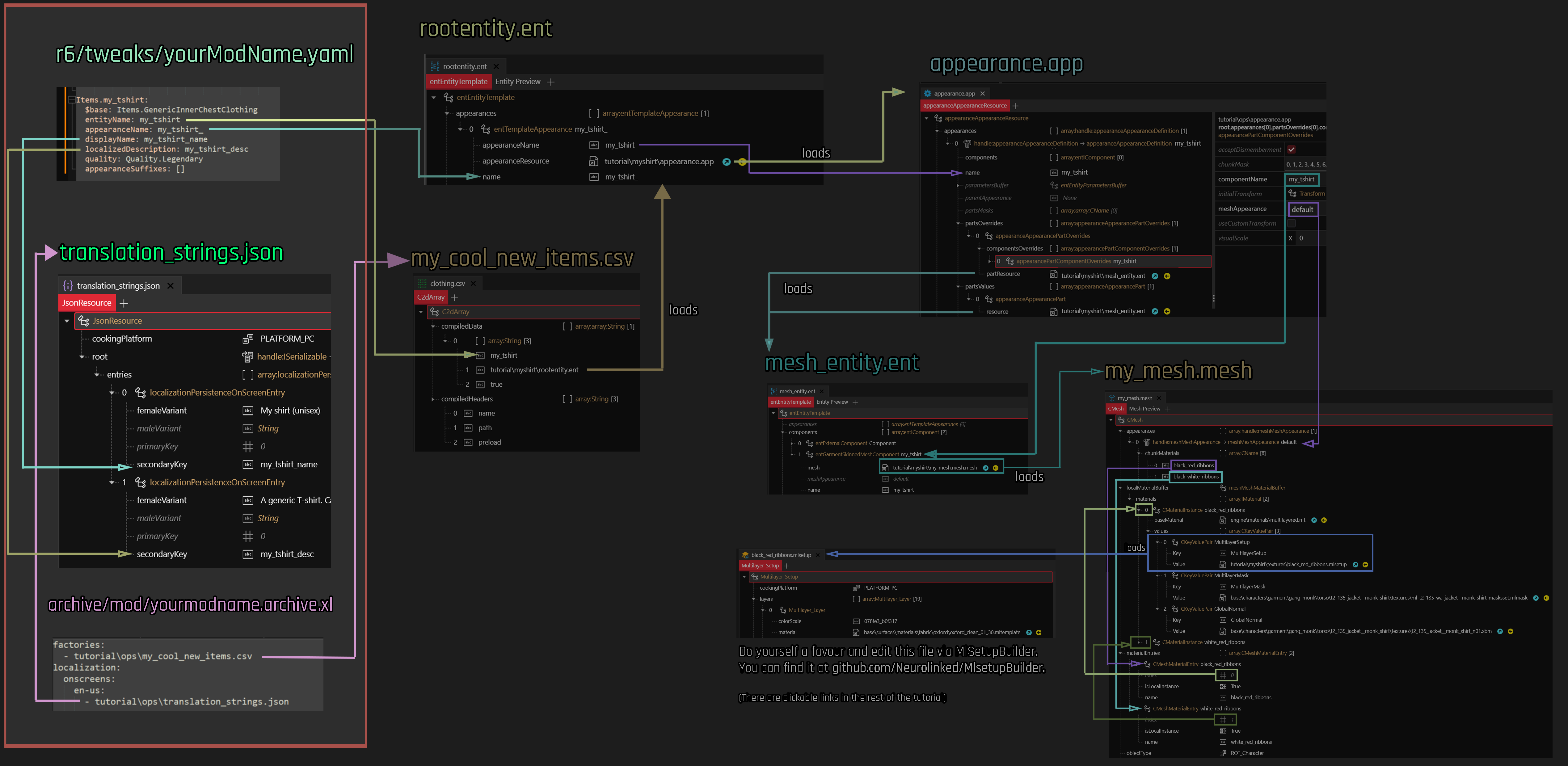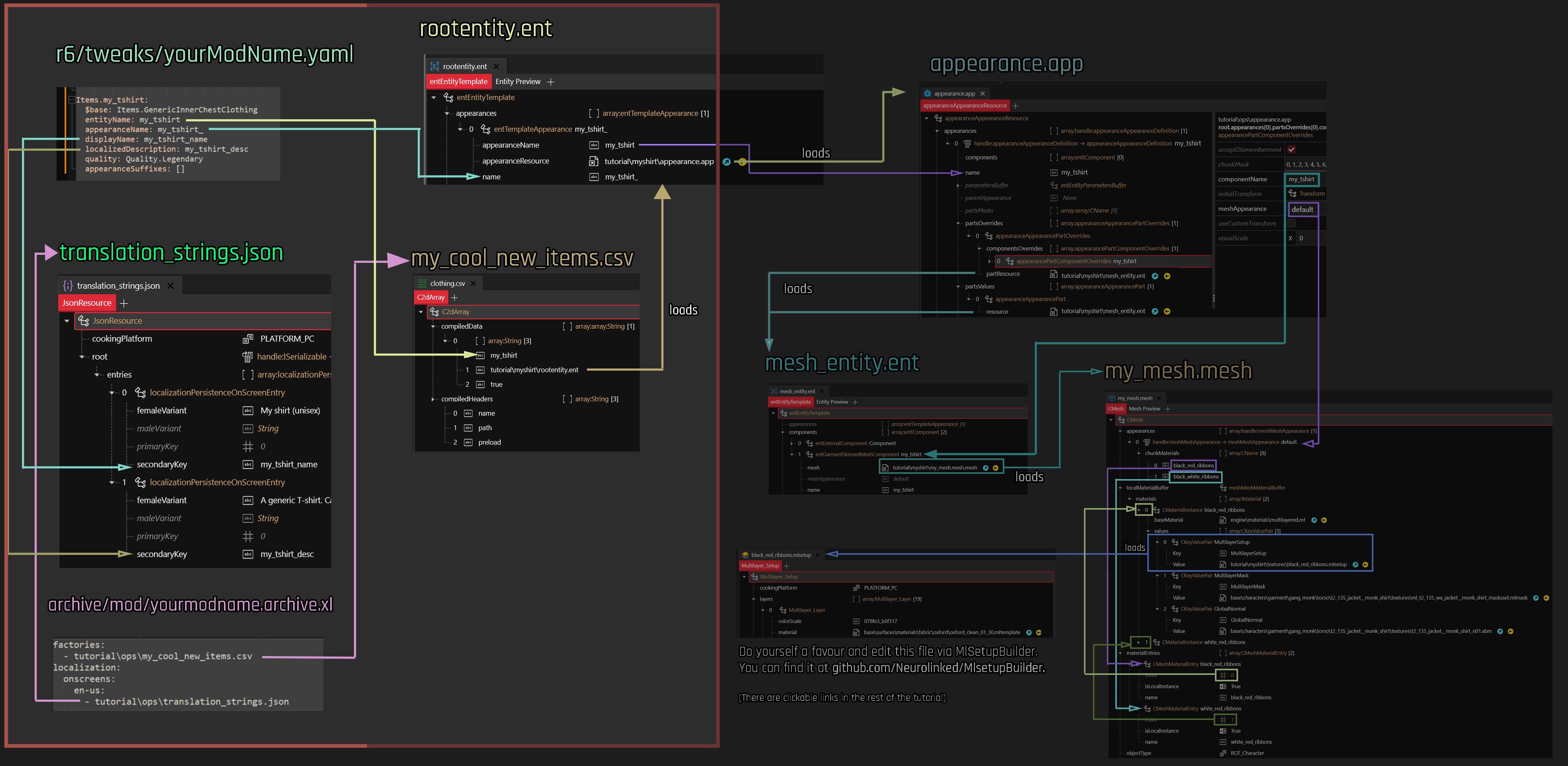 appearance.app: Check thepartsValuesandpartsOverridesentries. They need to point at themesh_entity.ent, not at the mesh.mesh_entity.ent: Does thecomponententry point to a valid mesh? Try it with a default mesh as detailed above.