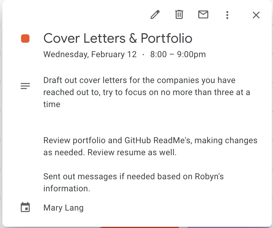The focus of my job search will be finding a hard working stimulating but also fun and supportive work environment in tech where I feel confident and motivated. I have already applied to some jobs, gotten a few rejections. I met with the CTO from Sondermind and I am anticipating to be contacted for a job posting they plan to post soon for a support engineer role. I am speaking with a contact from BNY this evening to discuss opportunities there, after being in touch with alumni recommended by Sal. I applied at Handshake where an alumni works and she said they could interview me sooner rather than later, so I said I would wait until mod 4, I just reached out letting her know I would be excited to interview soon. I met someone who works at Archer at a meetup, and applied to Archer with his recommendation. I have written cover letters for the jobs I have applied for and know that I will be updating my resume and portfolio soon.