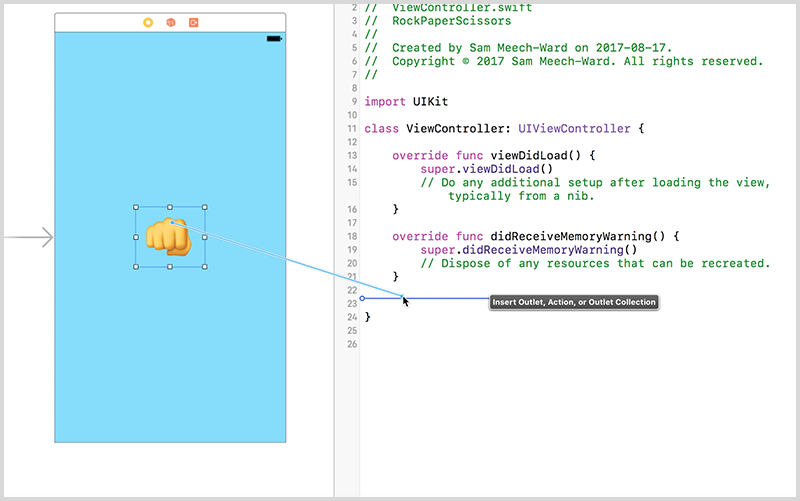 actionis selected as the connection type, name your actionplayRock, and clickconnect. This will create a new function in your swift file.