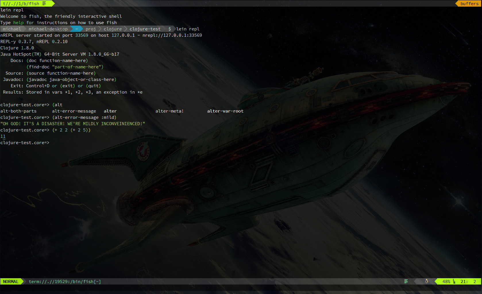 endfunctionNow you can easily from a clojure buffer start a repl in a split or new tab but sometimes it would be nice to just start such a repl from the terminal or via dmenu/rofi. Lets do that with some fish. Not shown are a few custom functions in-terminal exists and c.