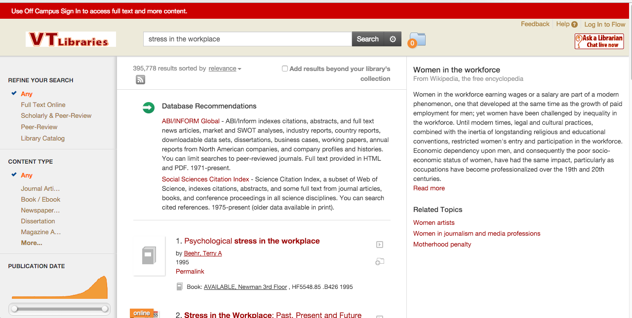 Yesterday (November 11, 2015) I tweeted about a search in the Summon discovery service for "stress in the workplace" that brought up the topic "Women in the workforce" from Wikipedia.1 This seemed not only an inappropriate subject to match the search terms, but also one that showed elements of gender bias. I've been following the work of Safiya Nobel, a faculty member in UCLA's Information Studies department. Dr. Nobel's work on gender and racial bias in commercial search engines has been really influential on my own thinking of the ethical responsibilities of libraries that provide digital research tools. I had previously thought that the indexing process of commercial discovery services were not as susceptible as the commercial algorithms that led to the systemic problems in Google's portrayal of women and girls of color. However, seeing this search made me rethink that position, since Summon relies on some algorithmic mechanism to match up these "topic" summaries with searches.