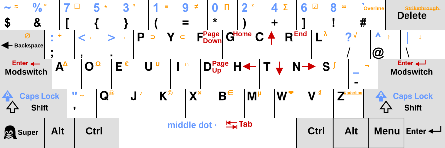 (blue keys←Shift, orange & red ones←Modeswitch, non characters are red)