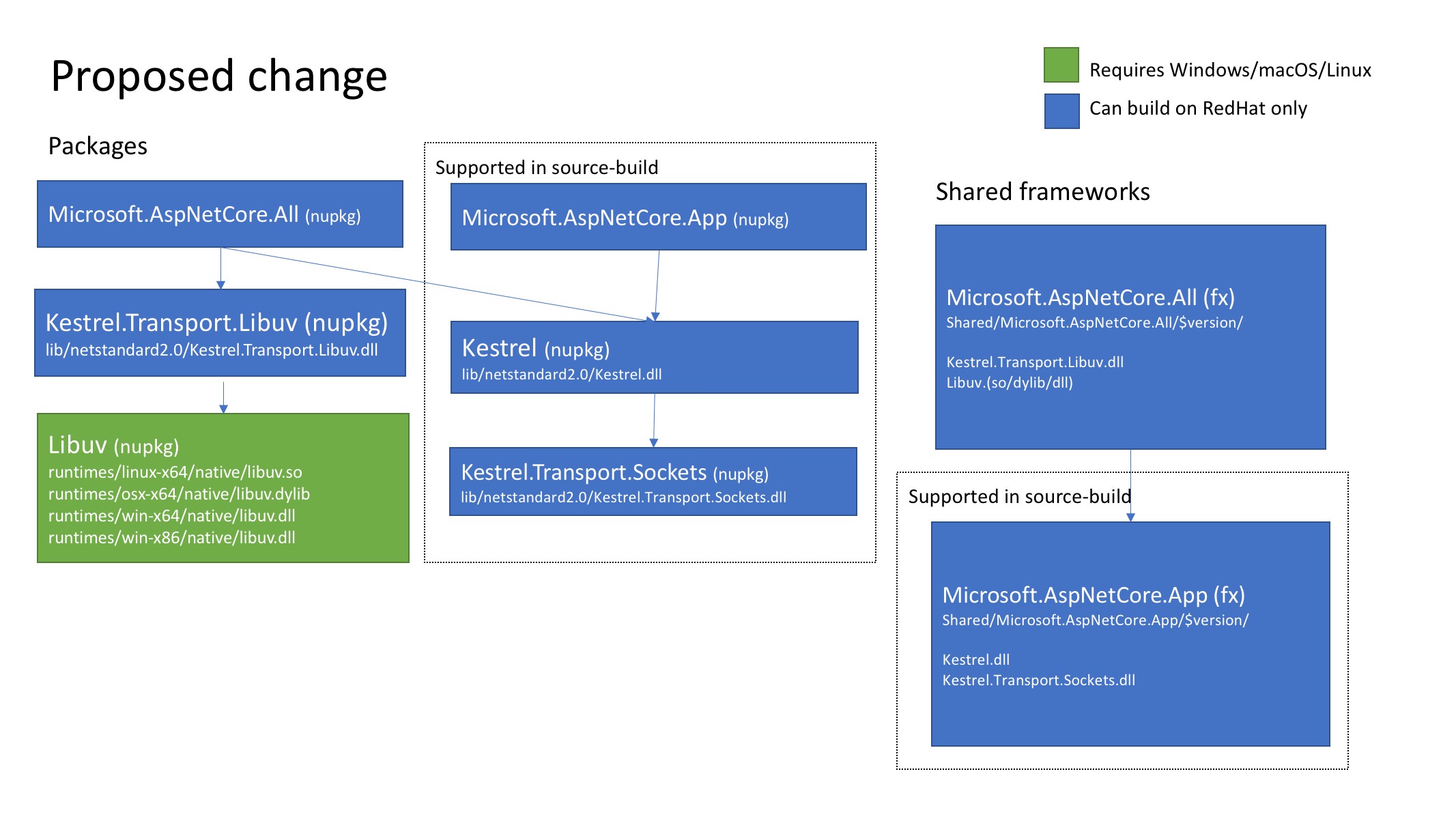 Split Kestrel packages into two packages following the pattern set by EFCore.Sqlite.Core/EFCore.SQLite. This would decouple packages that deliver the managed assemblies from those that deliver native binaries. The managed package binaries can be built from source, the native cannot. Remove the native package from the dependency graph of Microsoft.AspNetCore.App.