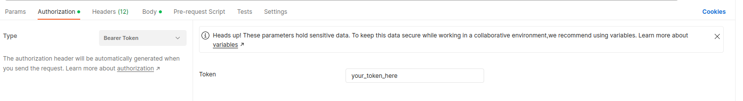 To resolve that, you just need to add a header called Authorization and fill it with the value Bearer 12345678, where 12345678 is the token you got from the Authentication request. If you are using Postman, you can also use the Authorization tab.
